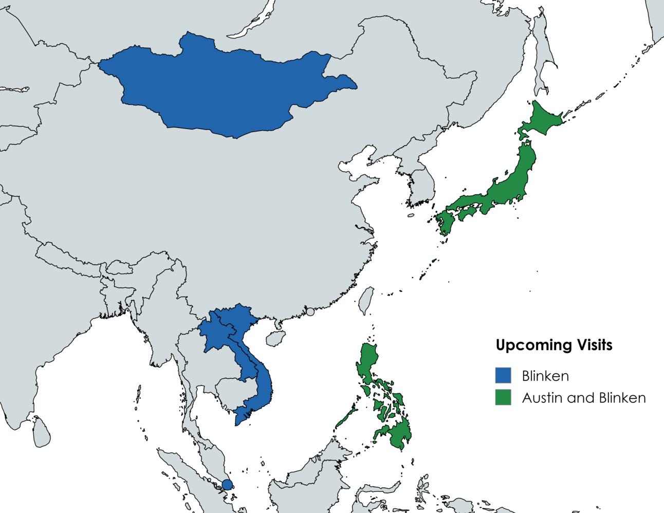 Blinken’s 8-day trip will take him to Vietnam, Laos, Japan, the Philippines, Singapore, and Mongolia. Blinken will join Austin in Tokyo (JP) and Manila (PH) for defense talks. Blinken will meet with a Chinese counterpart in Laos.